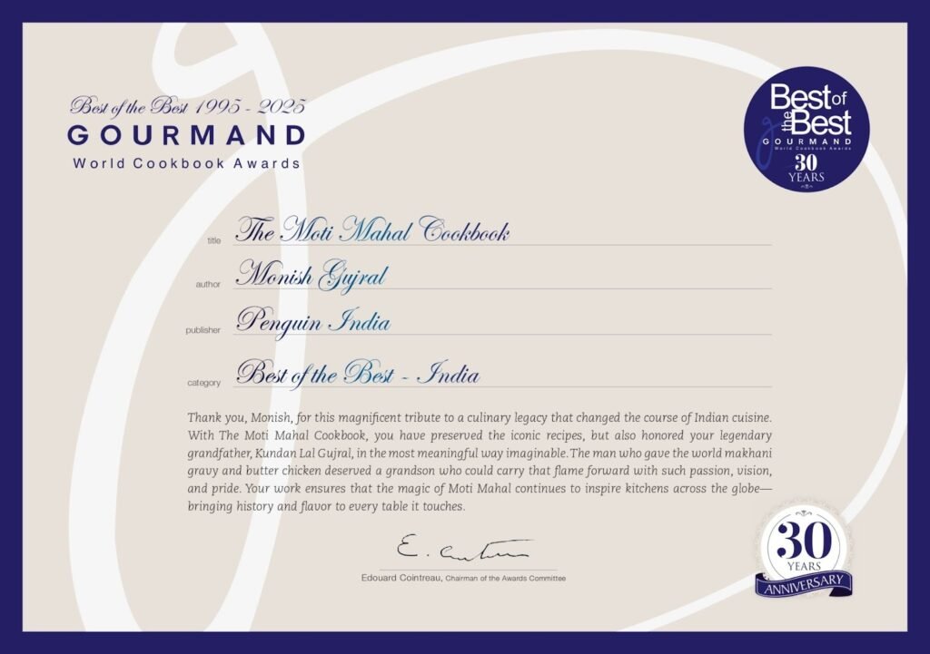 The Moti Mahal Cookbook, written by Monish Gujral and published by Penguin India in 2005, has achieved a prestigious global honor—winning the title of “Best of the Best – India (1995–2025)” at the Gourmand World Cookbook Awards, marking it as one of the most outstanding cookbooks published in the last 30 years.