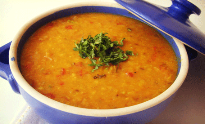 - In a pan heat butter and add hing for tempering and add on top of dal before serving al the lentil stir for few minutes. Serve hot garnished with chopped coriander